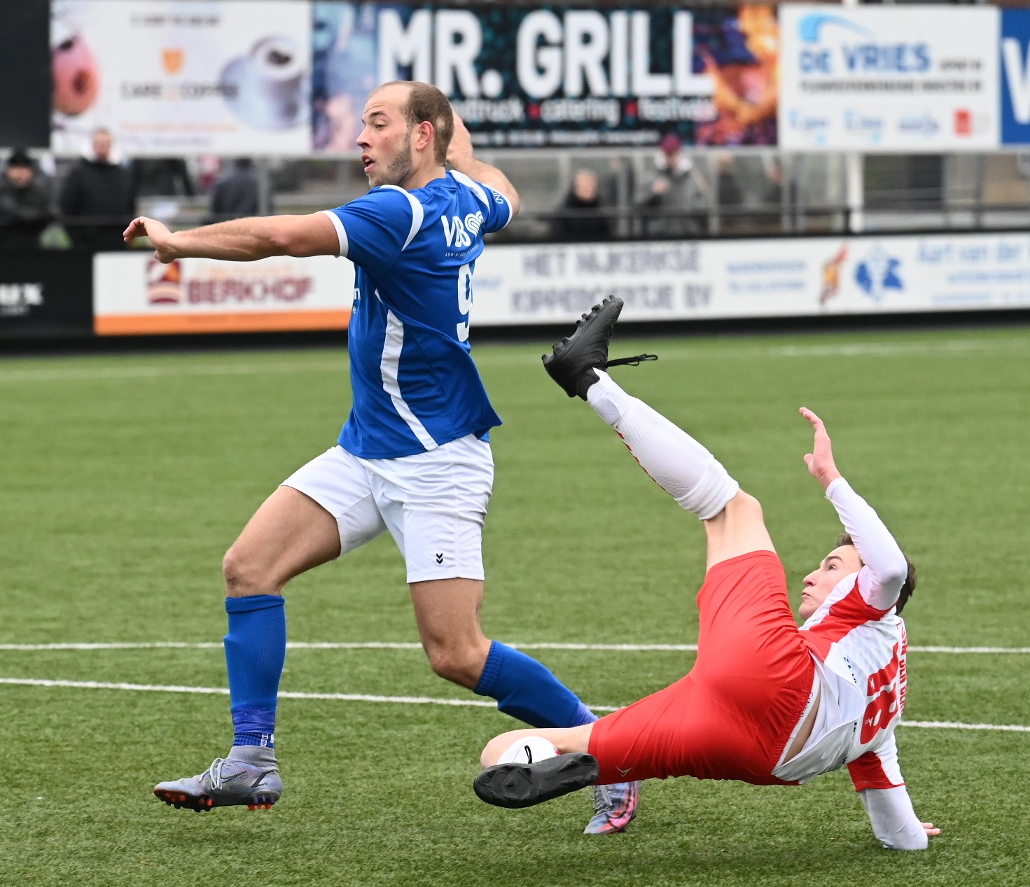 Foto: Kees van den HeuvelNa de 0-1 rechtte Veensche Boys de rug en vervolgens werd met een offensief keihard geknokt om de gelijkmaker op het scorebord te zetten. Dat lukte uiteindelijk ook, maar dat gebeurde op een cruciaal moment. Randje buitenspel nam Corné Parol de bal aan die de bal richting Tom van Donselaar speelde. Het was de topscoorder van de ploeg uit Nijkerkerveen die met een keihard schot wederom een goal kon toevoegen.